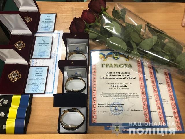Наручные часы получили инспекторы Управления патрульной полиции Максим Левенец, Владимир Шпорт и Владислава Марченкова. В конце апреля они задержали мужчину, который в Каменском во время покушения на убийство активиста Евгения Найды ранил двух прохожих.