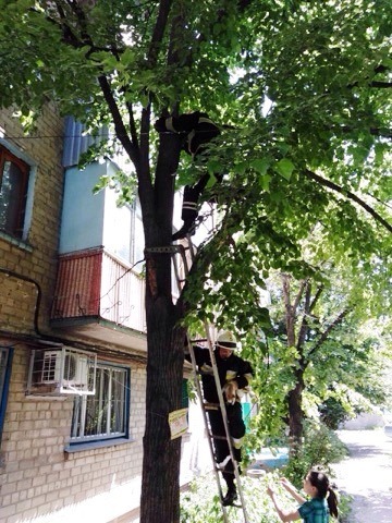 В этот же день в 11:01 в Службу спасения «101» поступило сообщение о том, что на улице Строителей, Чечеловского района города Днепр кот находится на дереве и не может самостоятельно слезть.