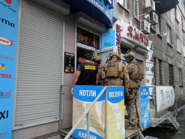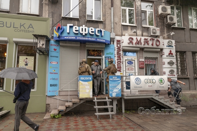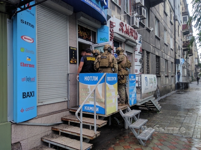 Сотрудники управления противодействия наркопреступности с привлечением бойцов спецподразделения «КОРД», экипированных оружием и бронежилетами, проводят спецоперацию в помещении магазина «Гефест» / обменного пункта по ул. Г.Романовой, 8.