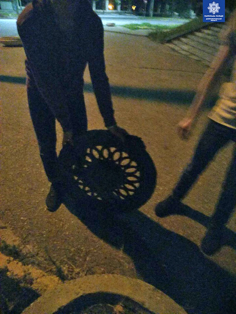 Вчера, 17 июля, около полуночи, во время патрулирования на улице Сергея Ефремова инспекторы заметили двух граждан, которые несли металлическую решетку круглой формы, которая служит частью декоративного украшения забора парка Шевченко.