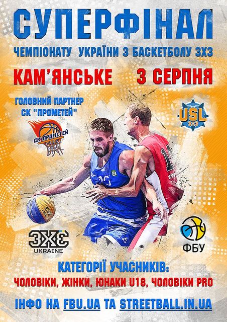 Федерация баскетбола Украины и Украинская стритбольная Лига 3х3 анонсируют Суперфинал чемпионата Украины по баскетболу 3х3, который состоится 3 августа в городе Каменское. Предварительно, местом проведения рассматривается Центральный городской парк. Главным партнером мероприятия выступает СК "Прометей".
