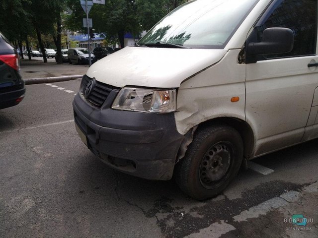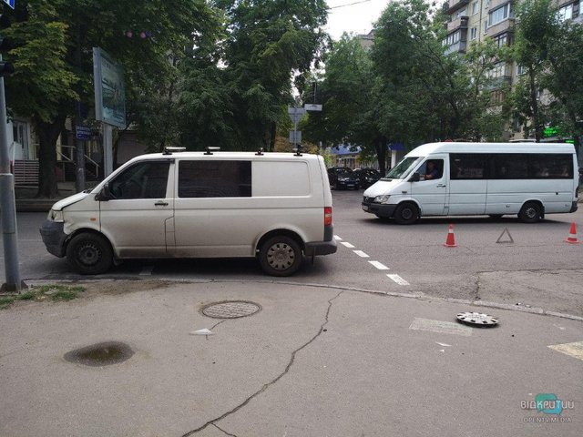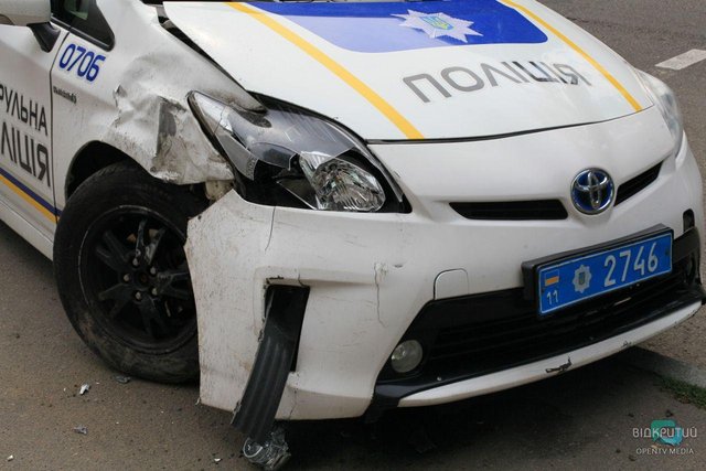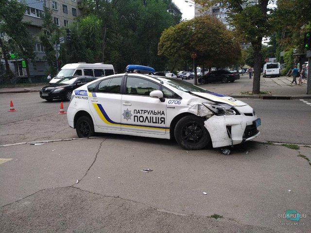 30 липня у Дніпрі на перехресті вулиць Володимира Великого і Воскресенської сталася дорожньо-транспортна пригода за участю мікроавтобуса Volkswagen, який рухався по Воскресенській, та поліційної автівки Toyota Prius, що їхала по Володимира Великого.