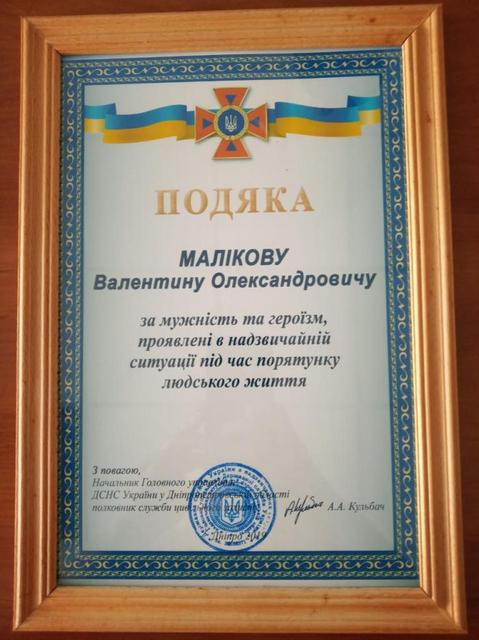 Благодарственным письмом начальника Главного управления ГСЧС в Днепропетровской области поощрили Валентина Маликова за мужество и героизм, проявленные в чрезвычайной ситуаций во время спасения человеческой жизни.