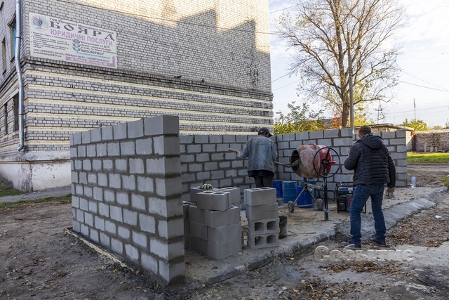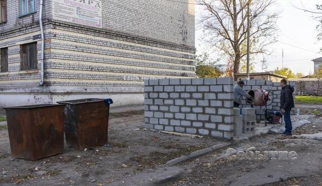 Секции, где в будущем будут стоять мусорные баки, ограждают стенками из шлакоблока.