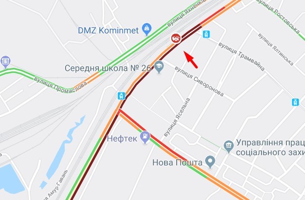 Из-за аварии перекрыты обе полосы дороги, проезд авто - по трамвайным путям, сообщает Днепр оперативный.Трамваи двигаются по графику.