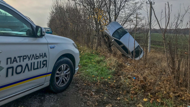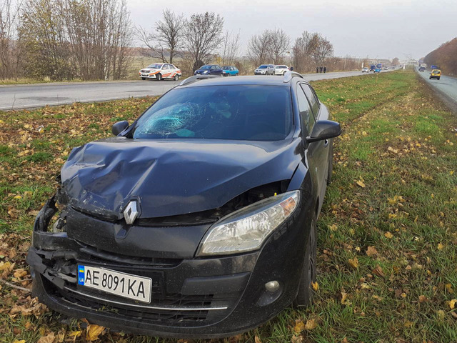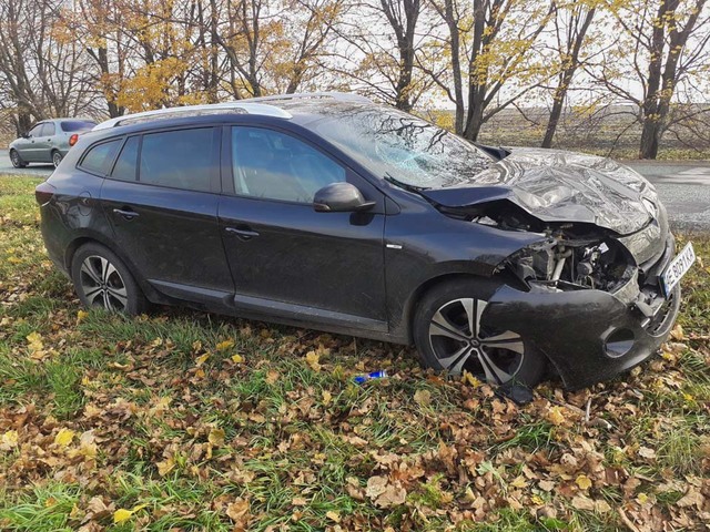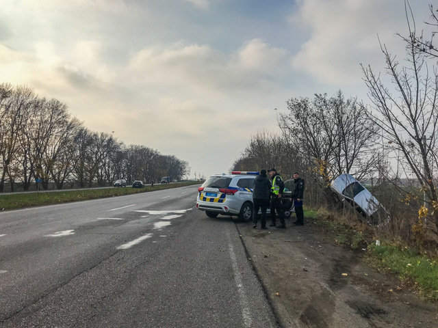 В пятницу, 8 ноября, на Криворожском шоссе столкнулись Renault и Skoda. От удара последний съехал с дороги, вылетел в кювет и буквально повис на дереве.