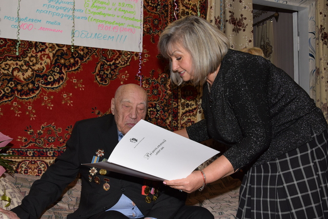 От имени городского головы Андрея Белоусова Татьяна Завгородняя поздравила юбиляра, пожелала крепкого здоровья во втором веке жизни, мира, благополучия и счастливого праздника в семейном кругу.