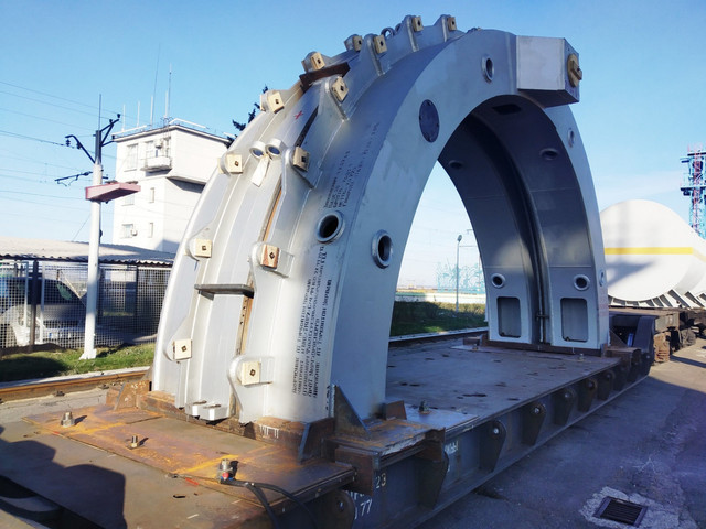«22 листопада на Середньодніпровску ГЕС у рамках реалізації проекту реконструкції прибуло нове регулювальне кільце для гідроагрегату №2. Діаметр колеса 7,68 м, а його вага 25 т! Довідка: призначення регулювального кільця – рівномірно розподілити зусилля сервомоторів на всі лопатки напрямного апарату та зберігати рівний кут відкриття лопаток», - указано в сообщении на официальной странице ЧАО «Укргидроэнерго».