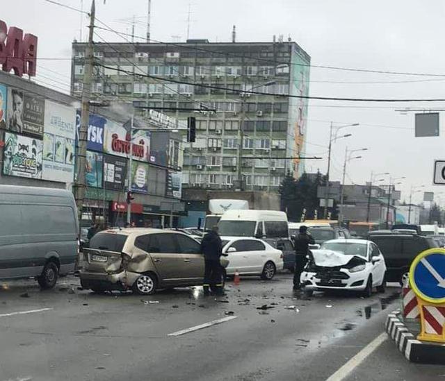 Днем 29 ноября в Днепре на Слобожанском проспекте столкнулись три легковушки и микроавтобус.