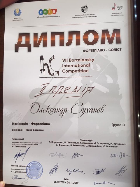 В Bortniansky International Competition принял участие студент III курса фортепианного отдела Каменского музыкального колледжа Александр Суханов (класс преподавателя Ирины Анатольевны Василеги). В конкурсной программе он исполнил такие произведения: Соната для фортепиано № 2 Людвига ван Бетховена, Скерцо №2 Фредерика Шопена, Трансцендентный этюд №1 Ференца Листа.