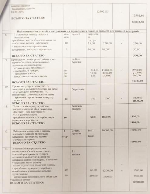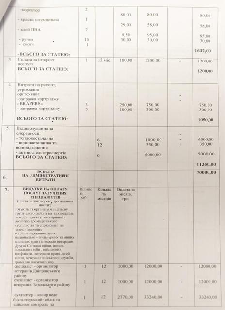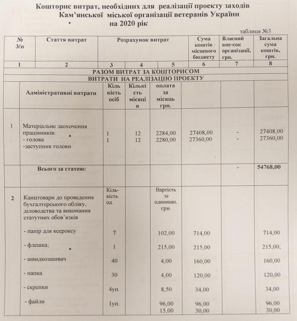 Так, если, например, «Патриот-2015» практически всю сумму планирует направить на разнообразные мероприятия для детей, молодежи и ветеранов АТО, то Каменская организация ветеранов Украины 124 510 гривны планирует потратить на поощрения главе и ее заместителю (54 678 гривен) и оплату труда «привлеченных специалистов» - бухгалтера и организаторов ветеранов районов города (69 832 гривны).