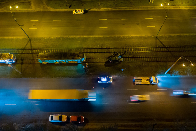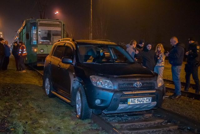 Со слов полиции, водитель Toyota утверждает, что у него повредилось колесо во время движения, он не справился с управлением и выехал на трамвайные пути. Проехав по ним небольшое расстояние, он остановился. Из-за этого движение трамваев №18 и №19 в сторону Кайдакского моста по шоссе парализовало и за автомобилем выстроилась очередь. Работу электротранспорта удалось восстановить к 22:00.