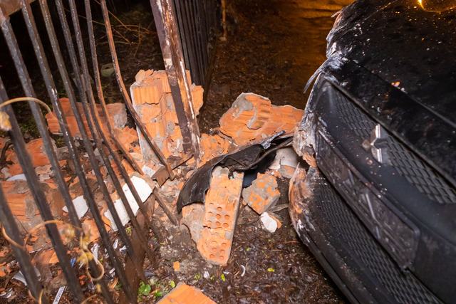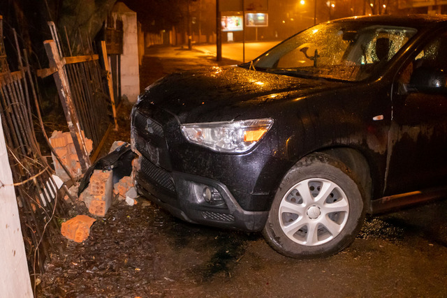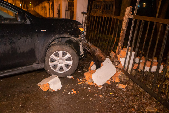 Возможно, водитель не справился с управлением и вылетел на пешеходную часть. Автомобиль бросили посреди тротуара. Машина существенно повреждена: у нее разбиты передняя и задняя части кузова. От удара рассыпалась кирпичная колонна ограждения.
