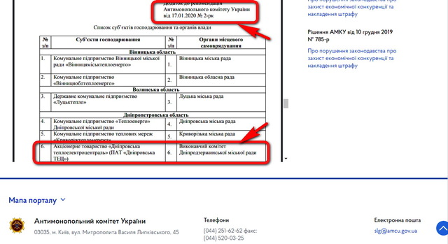 На сайте указанной контролирующей организации опубликован документ под названием «Рекомендации Антимонопольного комитета Украины №2-рк от 17 января 2020 года» (за подписью Ю. Терентьева, председателя АМК, на фото). В нем упомянуты органы местного самоуправления 30 городов Украины (охвачены все области). В списке есть и исполком нашего горсовета (правда, с названием до декоммунизации — Днепродзержинск).
