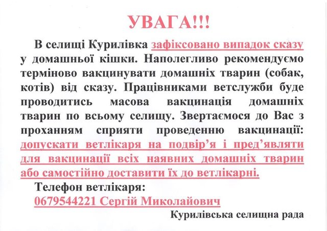 «Настойчиво рекомендуем вакцинировать домашних животных (котов, собак) от бешенства. Работниками ветслужбы будет проводиться массовая вакцинация домашних животных по всему селу. Обращаемся к вам с просьбой поспособствовать проведению вакцинации: пускать работников ветклиники во двор и предъявлять для вакцинации всех имеющихся домашних животных или самостоятельно доставить их в клинику», - говорится в уведомлении сельсовета.