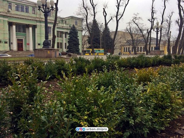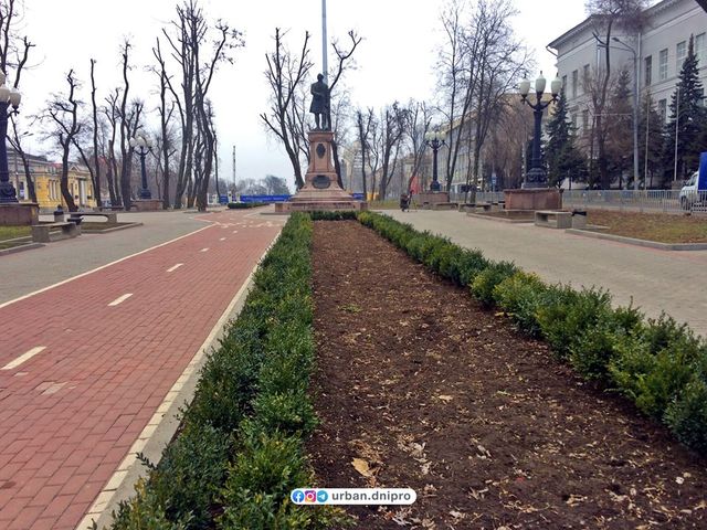 «На бульварі проспекту Дмитра Яворницького, перед пам'ятником Ломоносову, висадили багаторічні вічнозелені кущі.