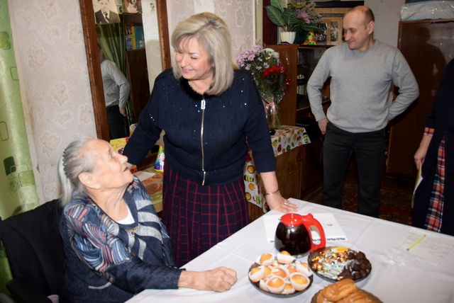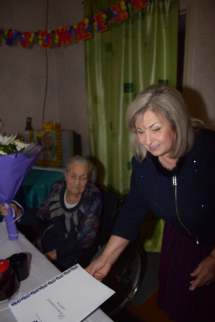 От имени городского головы Андрея Белоусова долгожительницу поздравила и вручила подарок заместитель городского головы по вопросам деятельности исполнительных органов городского совета Татьяна Завгородняя.