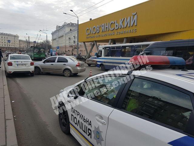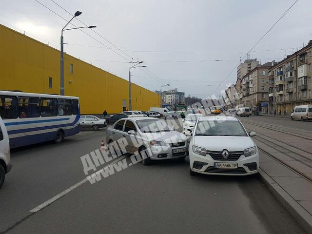 В Днепре на ул.Курчатова, недалеко от ТРЦ "Славянский" произошло ДТП. Водитель автомобиля Chevrolet объезжал автобус и въехал в Renault.