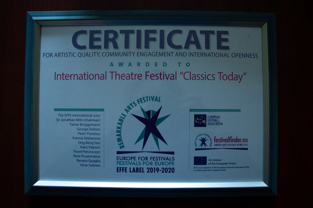 И вот, наконец, сертификат директору Театра им. Леси Украинки Маргарите Кудиной вручила Валентина Дамиан, представитель общественной организации «Центр развития «Демократия через культуру», которая является хабом в Украине проекта «Европа для фестивалей - Фестивали для Европы».