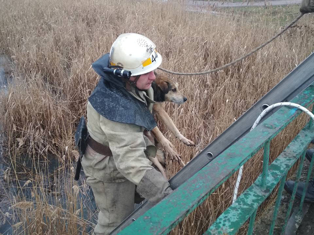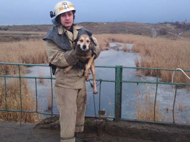 Спасатели дежурного караула 44 государственной пожарно-спасательной части Главного управления ГСЧС Украины в Днепропетровской области, прибыв на место происшествия установили, что пес находится в ледяной воде, посередине реки Базавлук, и из-за того, что пес зацепился цепью за камыш, он не может самостоятельно выбраться.