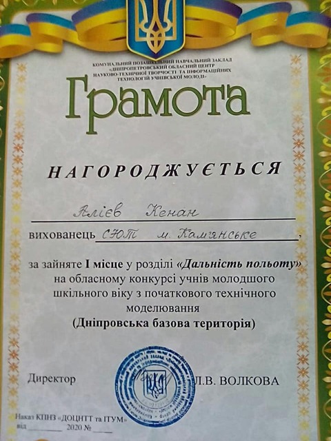 В конкурсе приняли участие кружковцы Станции юных техников города Каменское, которые стали победителями. Команда в составе воспитанников СЮТ Алексея Мороза и Кенана Алиева под руководством опытного педагога Ольги Бережной получила первое место на соревнованиях. А Кенан Алиев стал первым еще и в разделе «Дальность полета».