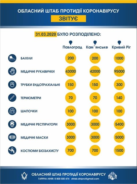 Больницы Павлограда, Каменского и Кривого Рога получат целом 170 тысяч пар медицинских перчаток, более 22 тыс масок и респираторов. Также получат бахилы, термометры, костюмы биозащиты и средства медпомощи.