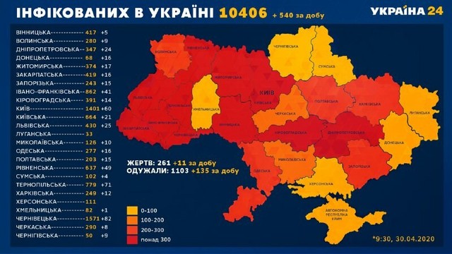 По данным Центра общественного здоровья, по состоянию на 9:00 1 мая в Украине 10 861 лабораторно подтвержденный случай COVID-19, из них 272 летальных, 1 413 пациента выздоровели. За сутки зафиксировано 455 новых случаев.