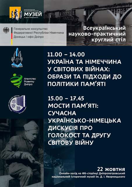 «22 жовтня о 10.00 у приміщенні Дніпропетровського національного історичного музею ім. Д. І. Яворницького відбудеться ВІДКРИТТЯ ВИСТАВКИ «Матеріальні сліди перебування німців на території України ХІХ – поч. ХХ ст.: мир і війна».