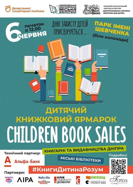 6 июня в Днепре впервые состоится беспрецедентная детская книжная ярмарка «Children book sales 2021». Мероприятие начнется в 12:00 в парке им. Т. Г. Шевченко (возле колоннады). Здесь будут представлены десятки тысяч книг разных жанров. Идея возникла из-за грядущей трансформации городских библиотек в современные библиохабы.