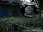 От внезапной атаки бензовоза пострадал припаркованный на СТО внедорожник. Прокладывая себе дорогу, огромная фура снесла металлический забор и несколько деревьев.