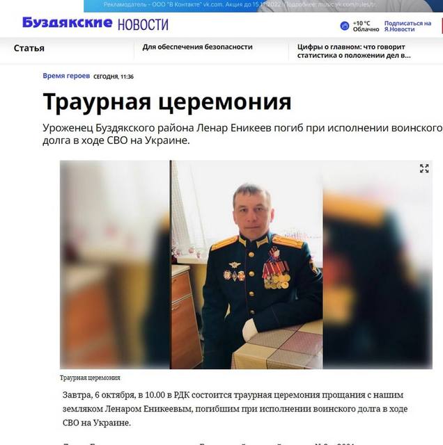 Еникеев участвовал в военных действиях РФ в Чечне и Грузии. С 20 марта он присоединился к полномасштабной войне РФ против Украины. Украинские бойцы уничтожили его 02 октября. Известно, что российский военный несет ответственность за обстрелы Никопольского района и самого Никополя.