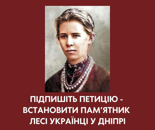 «Разом із письменниками нашого краю Січеславська Просвіта створила петицію із закликом ВСТАНОВИТИ ПАМ’ЯТНИК ЛЕСІ УКРАЇНЦІ НА ОДНОЙМЕННОМУ ПРОСПЕКТІ у місті Дніпрі.Монумент, присвячений Лесі Українці, потрібен нам, дніпрянам, щоб підкреслити панування українського духу на нашій землі!