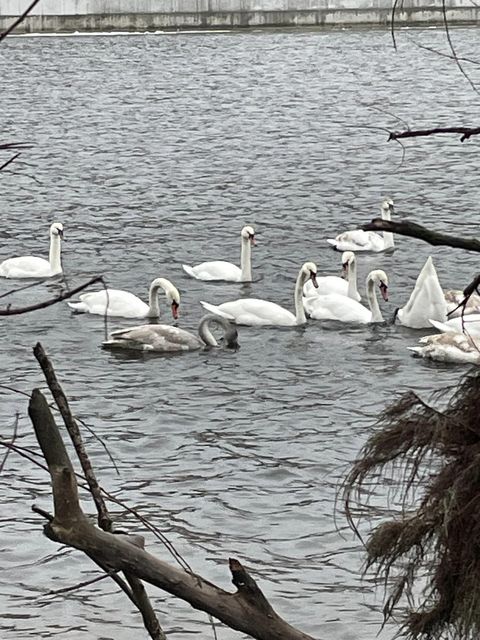 На Монастирському острові у Дніпрі помітили велику зграю лебедів.