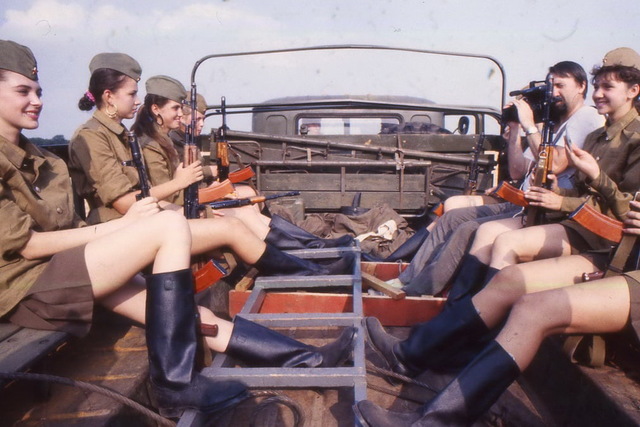 Командир части позже оправдывался, почему девки в сапогах и касках.