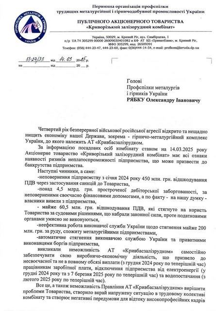 Згідно з відкритим листом адміністрації та профспілок, державна заборгованість перед підприємством із відшкодування ПДВ становить понад 330 млн грн. Окрім цього, 29 листопада 2024 року енергорозподільне підприємство відключило КЗРК від електропостачання через накопичені борги».