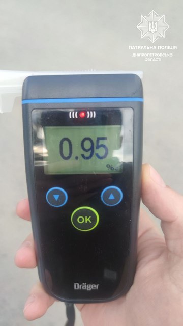 Під час спілкування з кермувальником Mitsubishi інспектори помітили у нього ознаки алкогольного сп'яніння і запропонували освідування у встановленому законом порядку за допомогою Драгеру. Чоловік погодився. Результат був позитивний — 0,95 проміле алкоголю в його крові.
