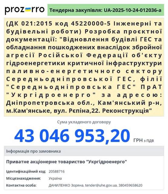 В системі Прозорро було проведено тендер «Розробка проектної документації: "Відновлення будівлі ГЕС та обладнання пошкоджених внаслідок збройної агресії Російської Федерації об'єкту гідроенергетики критичної інфраструктури паливно-енергетичного сектору Середньодніпровської ГЕС, філії "Середньодніпровська ГЕС"  м.Кам'янське».