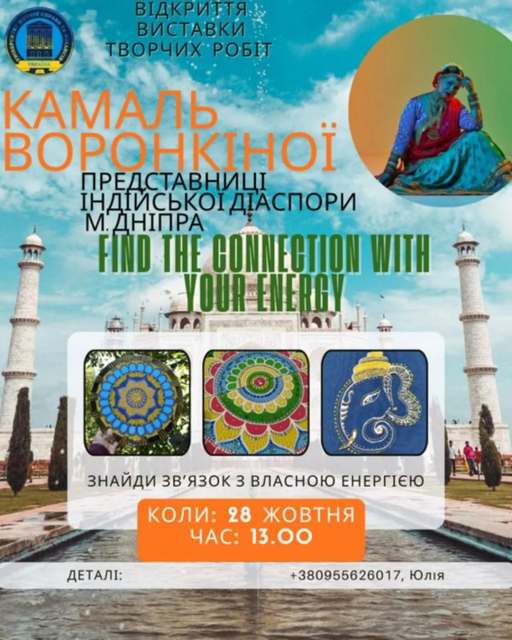 Це – виставка яскравих робіт Камаль Воронкіної, представниці індійської діаспори у нашому місті. Виставку «FIND THE CONNECTION WITH YOUR ENERGY – ЗНАЙДИ ЗВ'ЯЗОК З ВЛАСНОЮ ЕНЕРГІЄЮ» відкрито у співпраці цієї діаспори та Індійського центру, створеного в Університеті митної справи та фінансів.