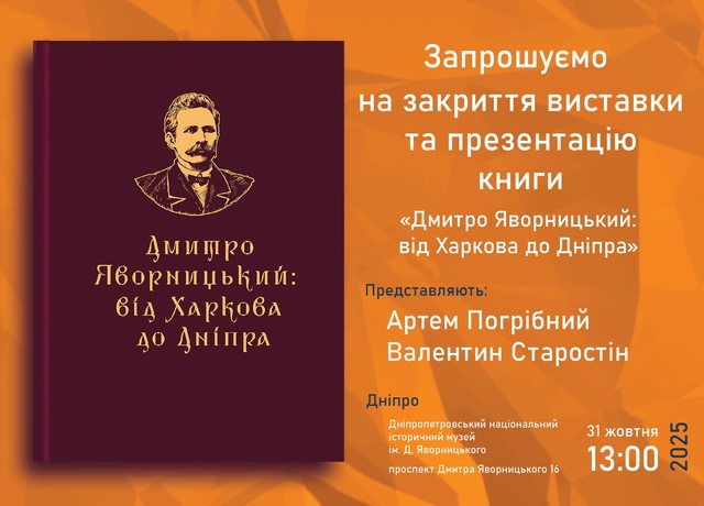 «31 жовтня о 13:00 в Дніпропетровському національному історичному музеї імені Д. І. Яворницького відбудуться закриття виставки «Яворницький. На шляху до історії козацтва» і презентація книги «Дмитро Яворницький: від Харкова до Дніпра».