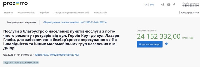 Соответствующий тендер размещен 4 ноября в системе Прозорро, с ним можно ознакомиться здесь.
