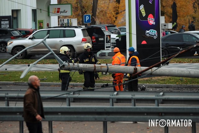 У понеділок, 10 листопада, у Дніпрі на Набережній Перемоги, біля АЗС “Окко”, сталася серйозна ДТП. Автомобіль BMW в'їхав у ліхтарний стовп. Після зіткнення опора повисла на дротах над дорогою. Рух тимчасово перекрито.
