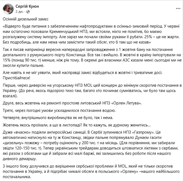 Сергей Куюн говорит, что цена на дизель выросла в среднем чуть больше, чем на 2 грн/л. Однако есть тенденция роста еще на 2-3 грн/л.