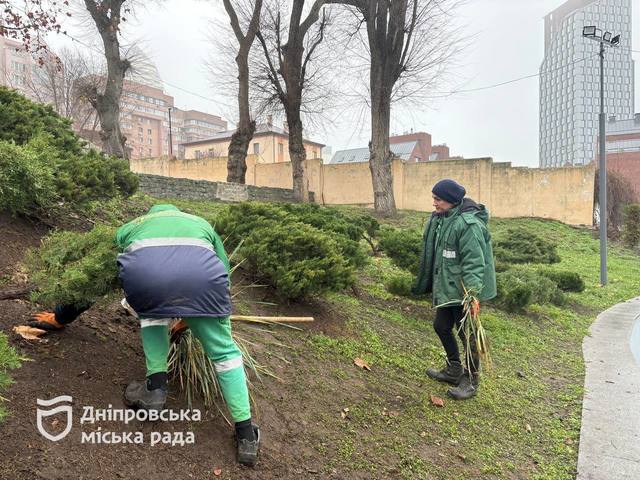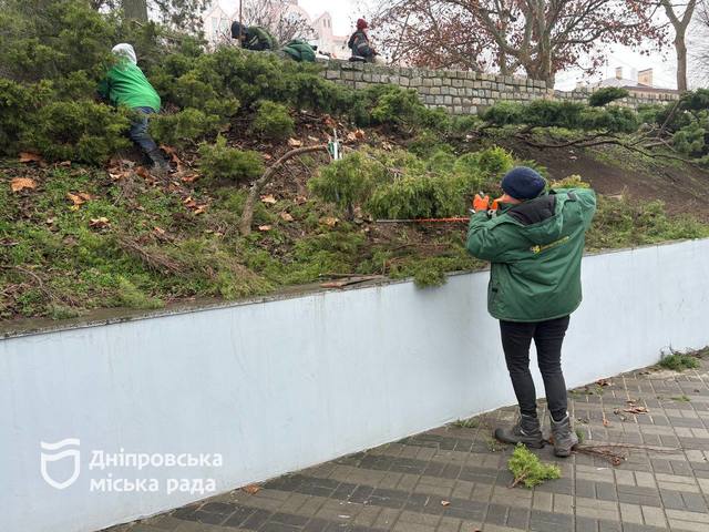 В парках, скверах Днепра продолжаются плановые сезонные работы по благоустройству и уходу за зелеными насаждениями. Сейчас такие работы выполняют и на смотровой площадке парка им.Т.Г. Шевченко. Специалисты коммунального предприятия «Городская инфраструктура» проводят связывание живой изгороди из туй.
