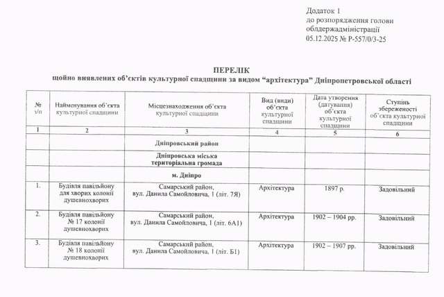 Відповідно до Розпорядження голови Дніпропетровської ОДА від 05.12.2025 №Р-557/0/3-25 на державний облік як щойно виявлені обʼєкти культурної спадщини, взято девʼять будівель, на підставі облікової документації, розробленої у 2025 році бюджетним коштом територіальної громади м. Дніпра.