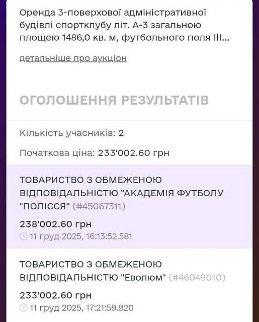 «За даними Prozorro, переможцем аукціону на право оренди стадіону «Локомотив» у Дніпрі стало ТОВ «Академія футболу “Полісся”».Йдеться про комплекс із футбольним полем та адміністративною будівлею.