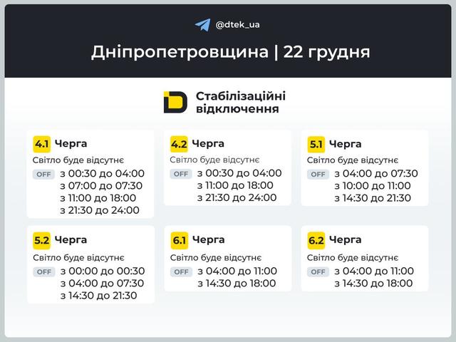 22 грудня, у більшості регіонів України будуть застосовуватись графіки погодинних відключень та графіки обмеження потужності (для промислових споживачів).