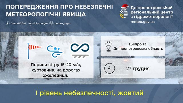 27 декабря в Днепре и Днепропетровской области ожидаются порывы северо-западного ветра 15-20 м/с. Вьюга. На дорогах гололедица.