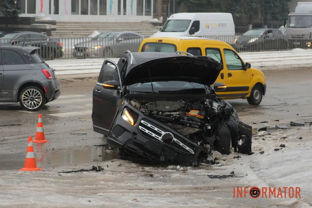 •  У Дніпрі на проспекті Богдана Хмельницького Mercedes після зіткнення з Fiat ледь не вилетів на тротуар у пішохода (відео моменту) (2)