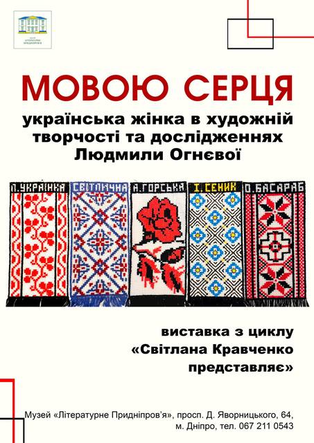 Виставка «МОВОЮ СЕРЦЯ: українська жінка в художній творчості та дослідженнях Людмили Огнєвої» з циклу «Світлана Кравченко представляє». В експозиції ви побачите книги – результати дослідницької роботи Людмили Огнєвої, та виконані нею вишивки, присвячені стійкості та патріотизму українських жінок.