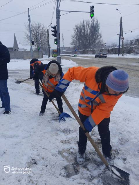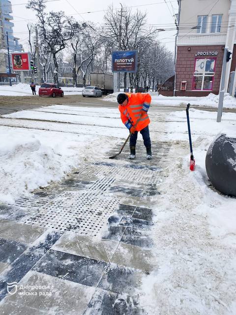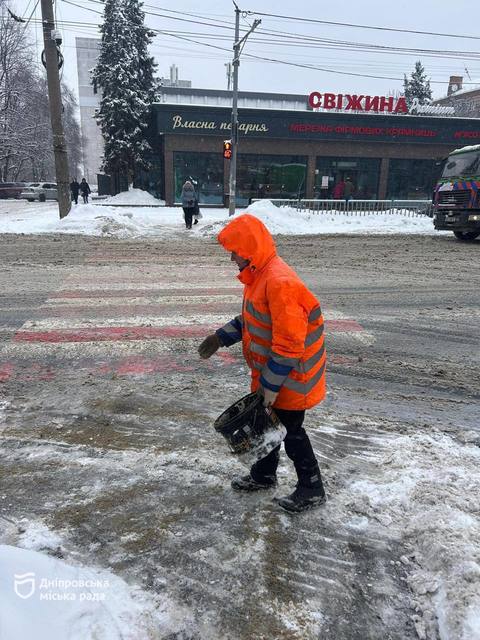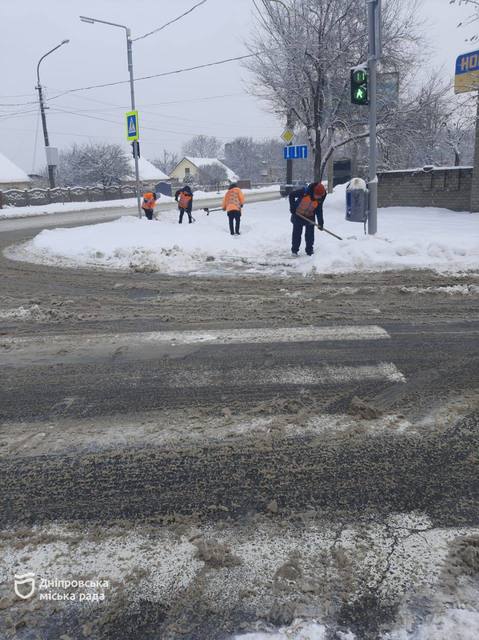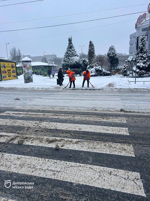 Из-за снегопада коммунальные службы Днепра продолжают работать на городских дорогах и тротуарах для безопасности движения
